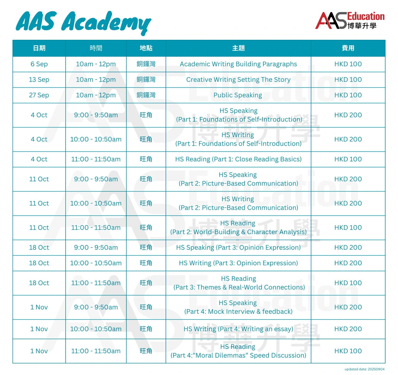 | 4 Oct | 旺角 | 中學面試訓練: HS Speaking (Part 1: Foundations of Self-Introduction) | HKD 200 |
